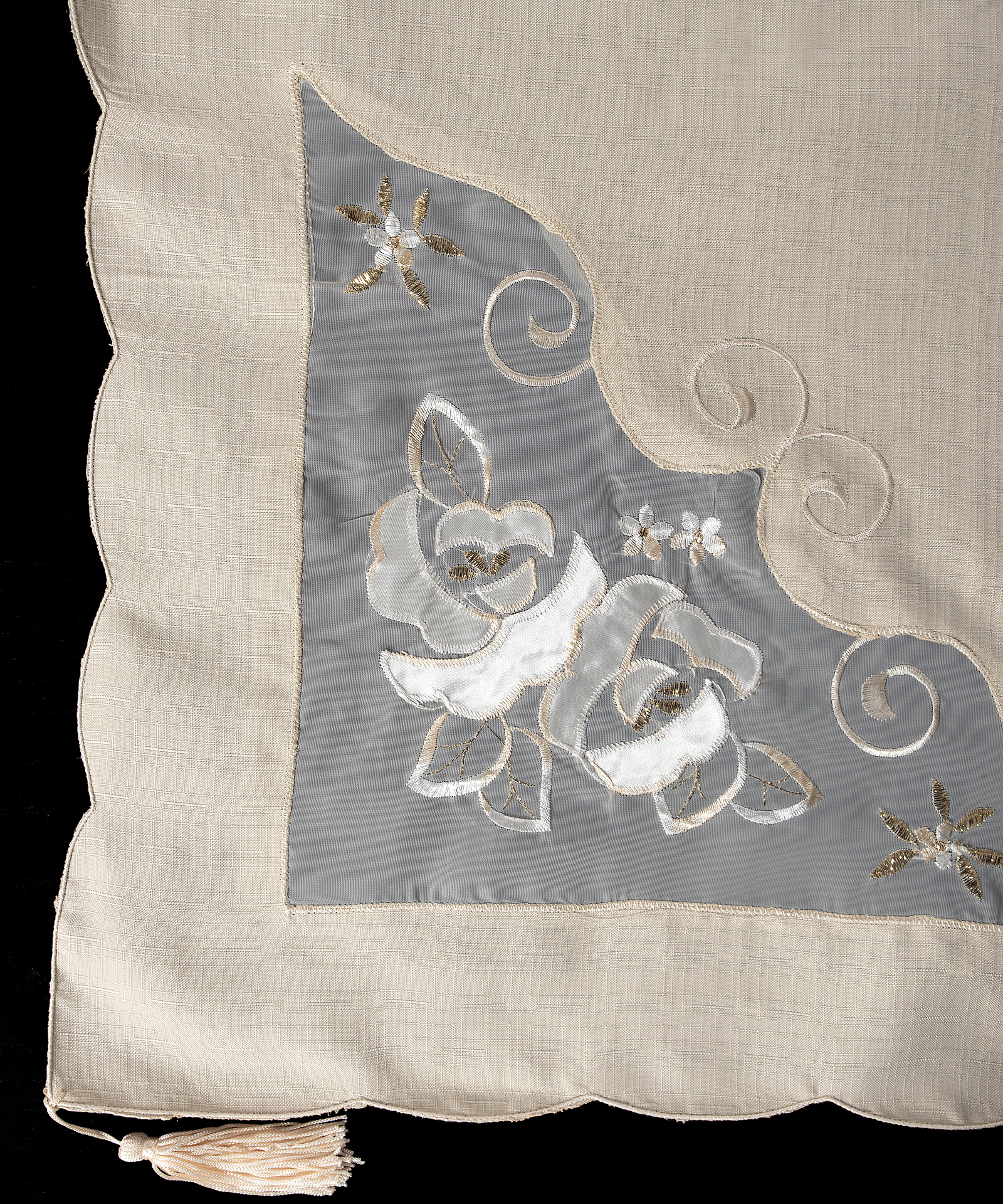 Πανέμορφη σειρά σε μπεζ απόχρωση με ρομαντικά κεντημένα σχέδια. Διαθέσιμη σε σετ 7 τμχ. αποτελούμενο από : τραπεζοκαρέ 140×140 εκ. , 2 πετσέτες 40×40 εκ. , καρέ 90×90 εκ. , σεμέν 40×110 εκ. και 2 πετσέτες 60×60 εκ. και σετ 4 τμχ. αποτελούμενο από : καρέ 90×90 εκ. , σεμέν 40×110 εκ. και 2 πετσέτες 40×40 εκ. Σύνθεση : 100% polyester