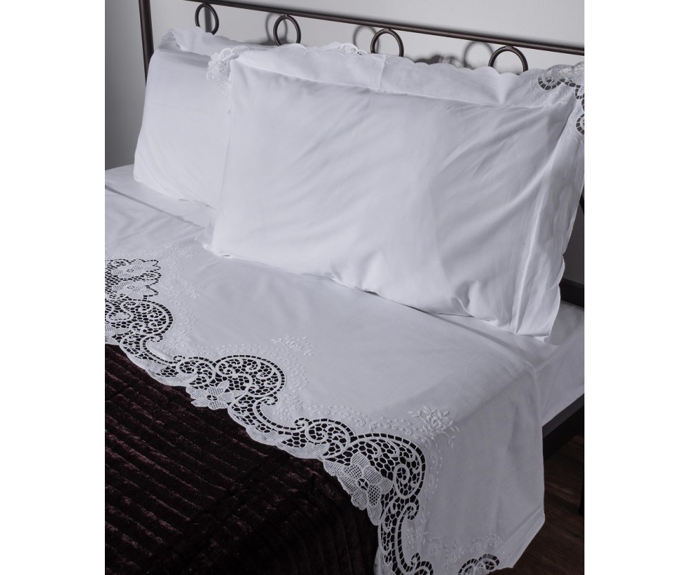 Βαμβακερό χειροποίητο σεντόνι με κηπούρ 225Χ270 εκ. , κατωσέντονο και δύο μαξιλαροθήκες  50Χ75 εκ. Σε λευκό χρώμα και 100% βαμβακερό.