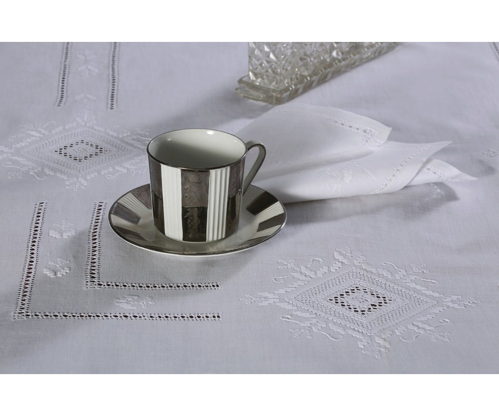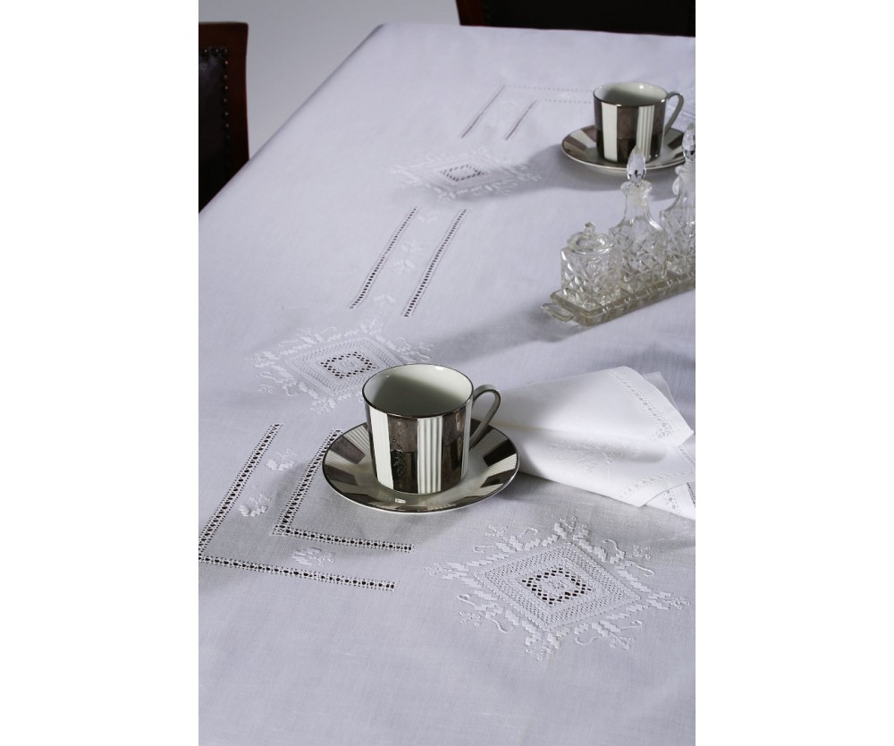 Χειροποίητο τραπεζομάντηλο 170Χ220 εκ. , με ανεβατό και φιλτιρέ πάνω σε βαμβακερό και λινό πανί. Το τραπεζομάντηλο συνοδεύεται από 8 πετσέτες με κέντημα. Σύνδεσης : 50% βαμβάκι / 50% λινό. Σε λευκή απόχρωση.