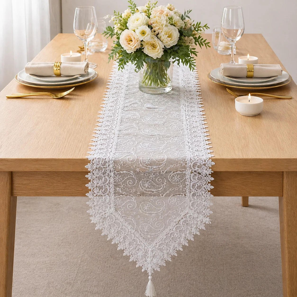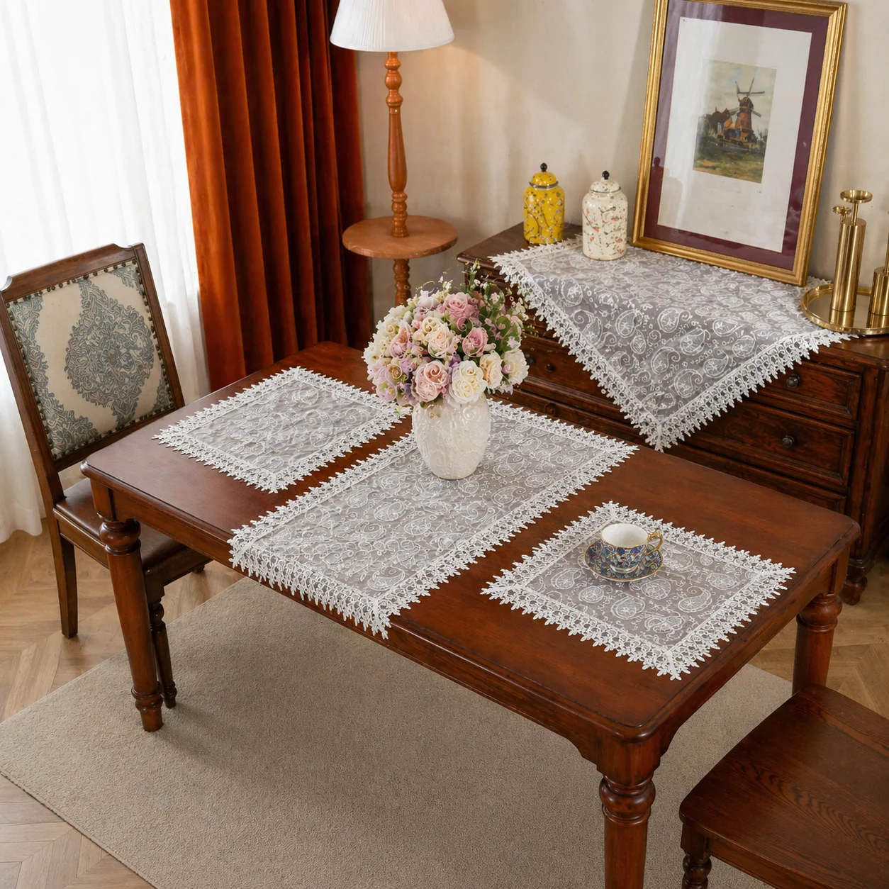 Κομψή διακοσμητική σειρά με δαντελένιο τελείωμα και ιδιαίτερο κεντητό σχέδιο, ιδανική για τραπέζι σαλονιού, τραπεζαρία, κονσόλα ή μπουφέ. Προσφέρει κλασικό και προσεγμένο αποτέλεσμα στον χώρο, ενώ ταιριάζει εύκολα τόσο σε καθημερινή όσο και σε πιο επίσημη διακόσμηση.