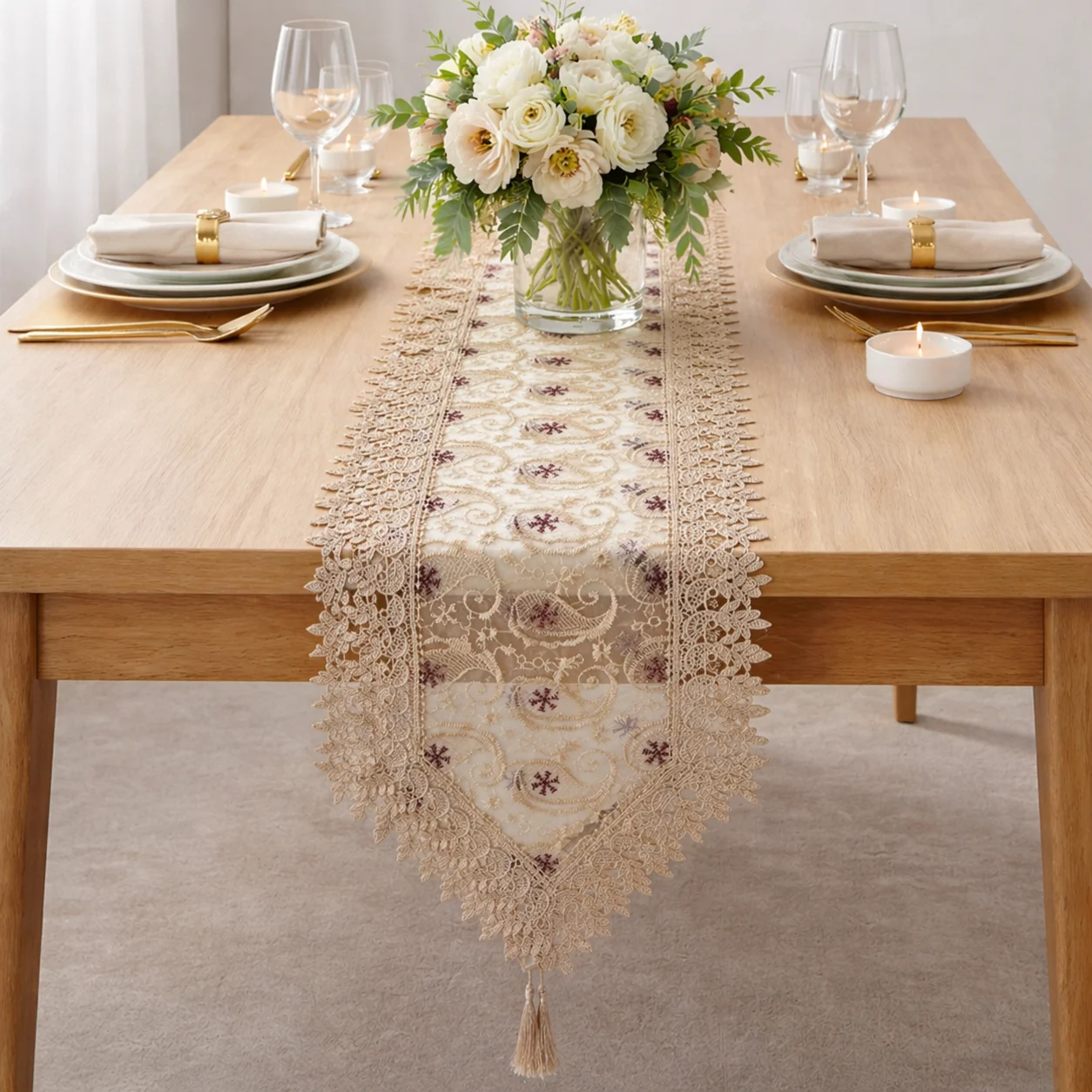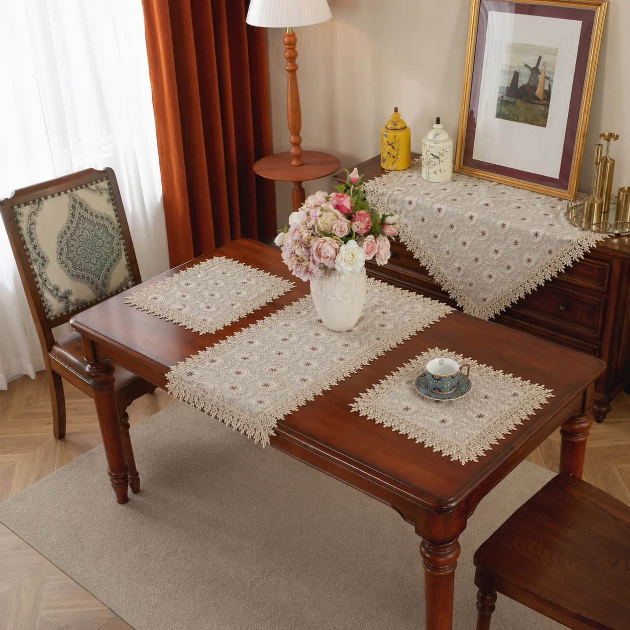 Κομψή διακοσμητική σειρά με δαντελένιο τελείωμα και ιδιαίτερο κεντητό σχέδιο, ιδανική για τραπέζι σαλονιού, τραπεζαρία, κονσόλα ή μπουφέ. Προσφέρει κλασικό και προσεγμένο αποτέλεσμα στον χώρο, ενώ ταιριάζει εύκολα τόσο σε καθημερινή όσο και σε πιο επίσημη διακόσμηση.