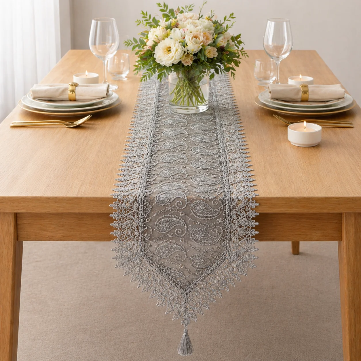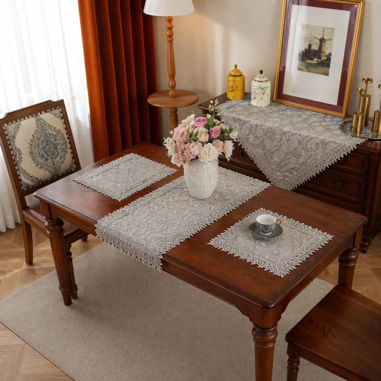 Κομψή διακοσμητική σειρά με δαντελένιο τελείωμα και ιδιαίτερο κεντητό σχέδιο, ιδανική για τραπέζι σαλονιού, τραπεζαρία, κονσόλα ή μπουφέ. Προσφέρει κλασικό και προσεγμένο αποτέλεσμα στον χώρο, ενώ ταιριάζει εύκολα τόσο σε καθημερινή όσο και σε πιο επίσημη διακόσμηση.