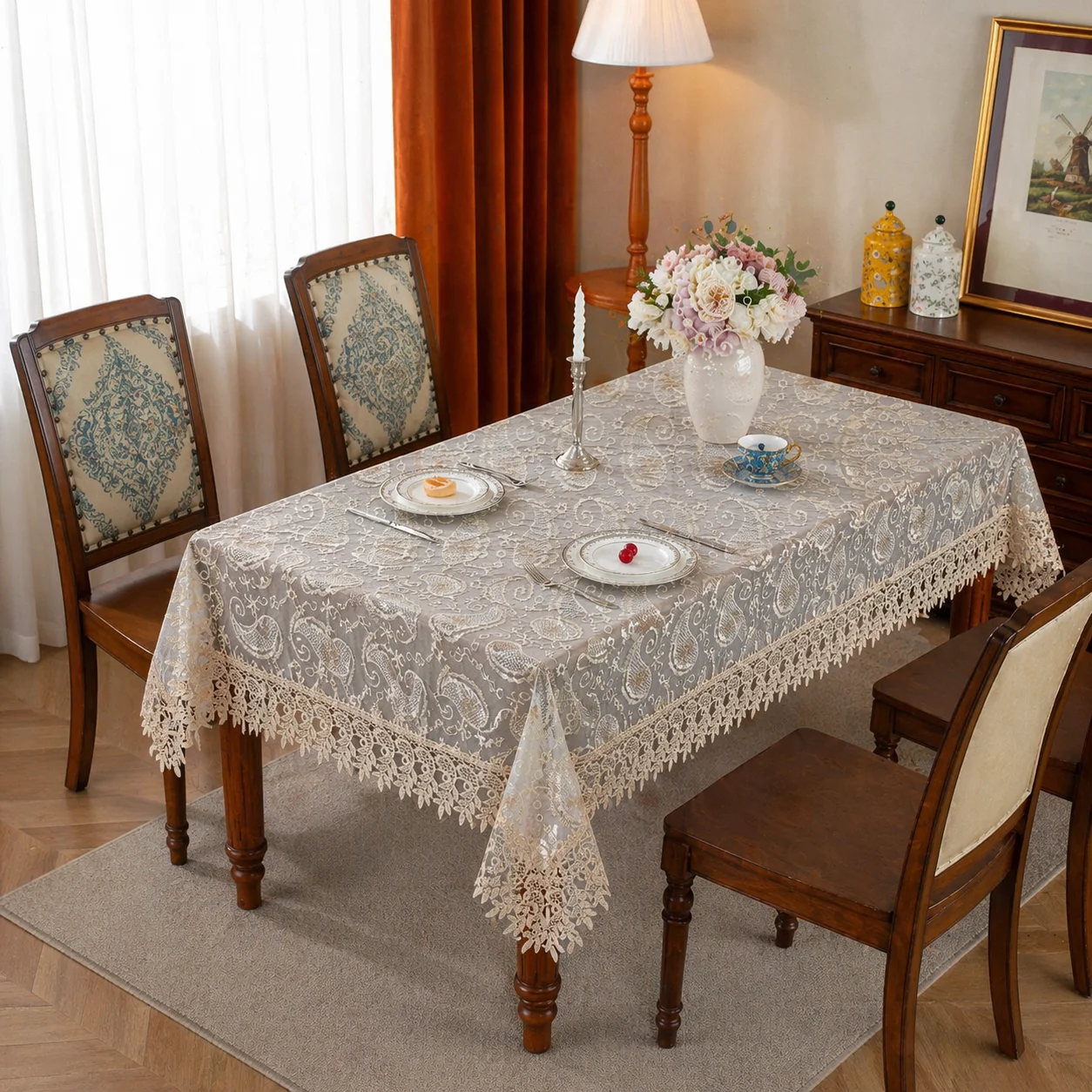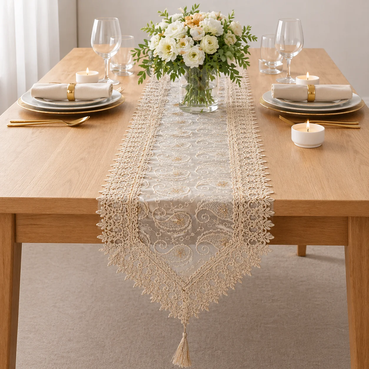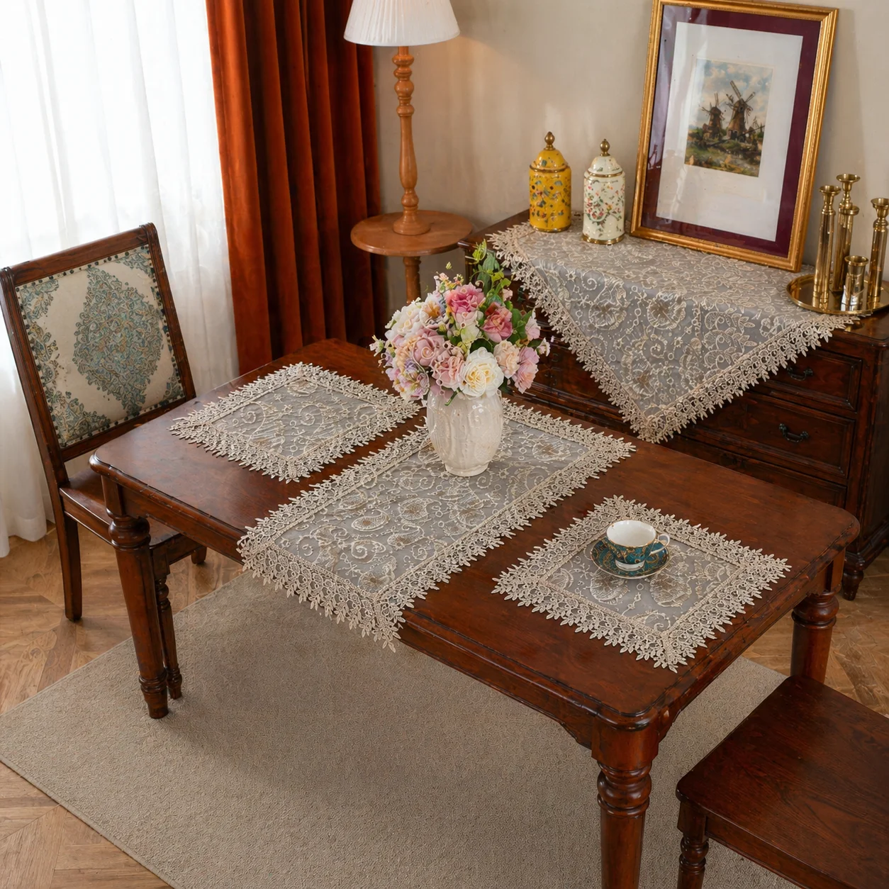 Κομψή διακοσμητική σειρά με δαντελένιο τελείωμα και ιδιαίτερο κεντητό σχέδιο, ιδανική για τραπέζι σαλονιού, τραπεζαρία, κονσόλα ή μπουφέ. Προσφέρει κλασικό και προσεγμένο αποτέλεσμα στον χώρο, ενώ ταιριάζει εύκολα τόσο σε καθημερινή όσο και σε πιο επίσημη διακόσμηση.