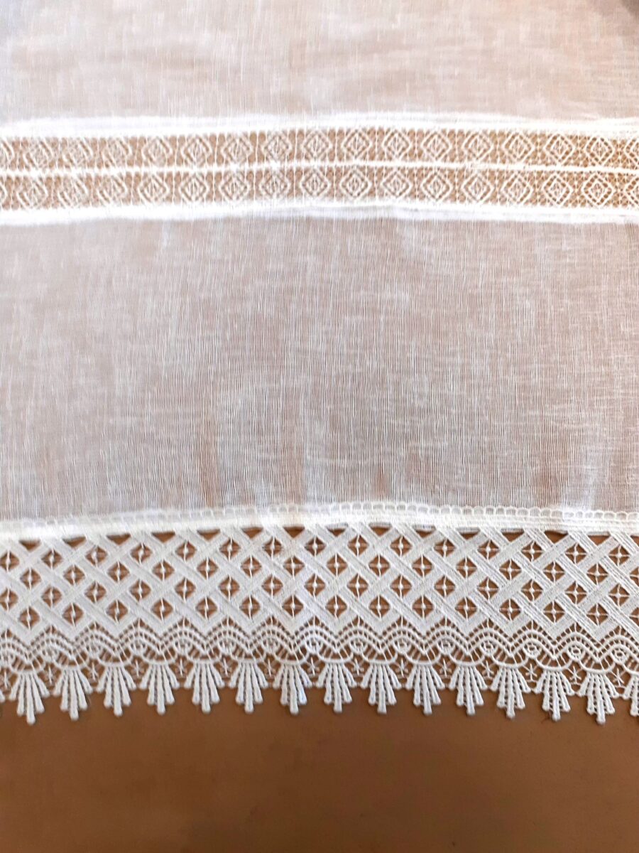 Υπέροχη κουρτίνα από από σύμμεικτο βαμβακερό – polyester ύφασμα , με όμορφη δαντέλα στο τελείωμα και ατραντέ μηχανής. Εμπνευσμένα από την παράδοση , σε ζαχαρί απόχρωση. Μία ΄΄διαφορετική΄΄ πρόταση για εσάς !! Διατίθεται σε ύψος 140 εκ.(τιμή ανά μέτρο 23.00 ευρώ) και 280 εκ. (τιμή ανά μέτρο 32.00 ευρώ) Το ύψος της κουρτίνας είναι συγκεκριμένο και εσείς επιλέγετε ότι πλάτος θέλετε! Στη διάθεση σας για οποιαδήποτε απορία έχετε, επιπλέον οι κουρτίνες ράβονται στα μέτρα σας κατόπιν συνεννόησης!