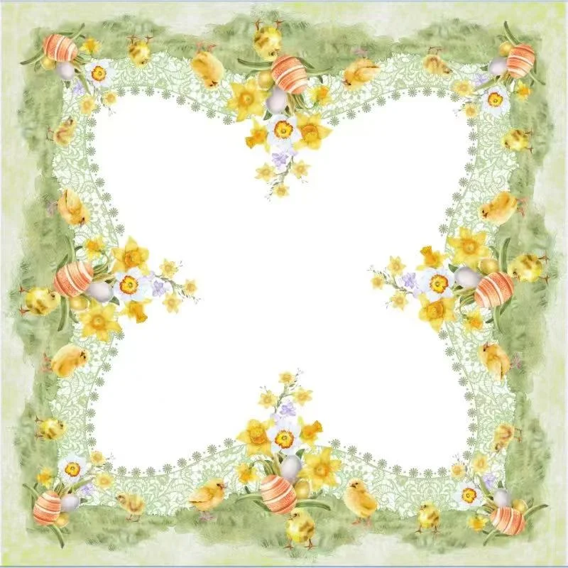 Πασχαλινό τραπεζομάντηλο με χαρούμενο, ανοιξιάτικο σχέδιο (λαγουδάκια, λουλούδια και πασχαλινές λεπτομέρειες), ιδανικό για να στολίσετε το τραπέζι στο σπίτι, στο εξοχικό ή σε επαγγελματικό χώρο. Ταιριάζει τέλεια σε Πάσχαάνοιξη, οικογενειακά τραπέζια και θεματική διακόσμηση.
