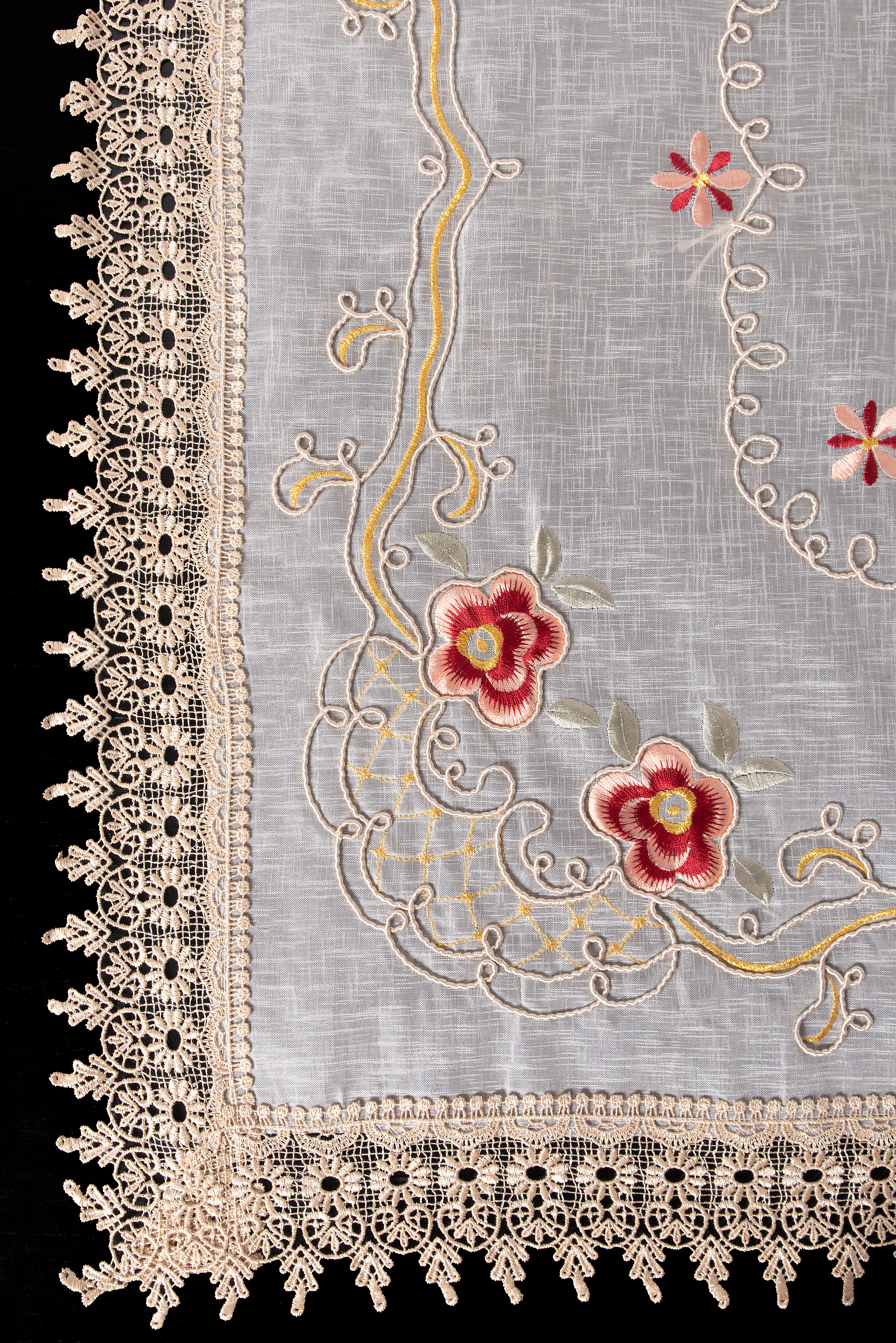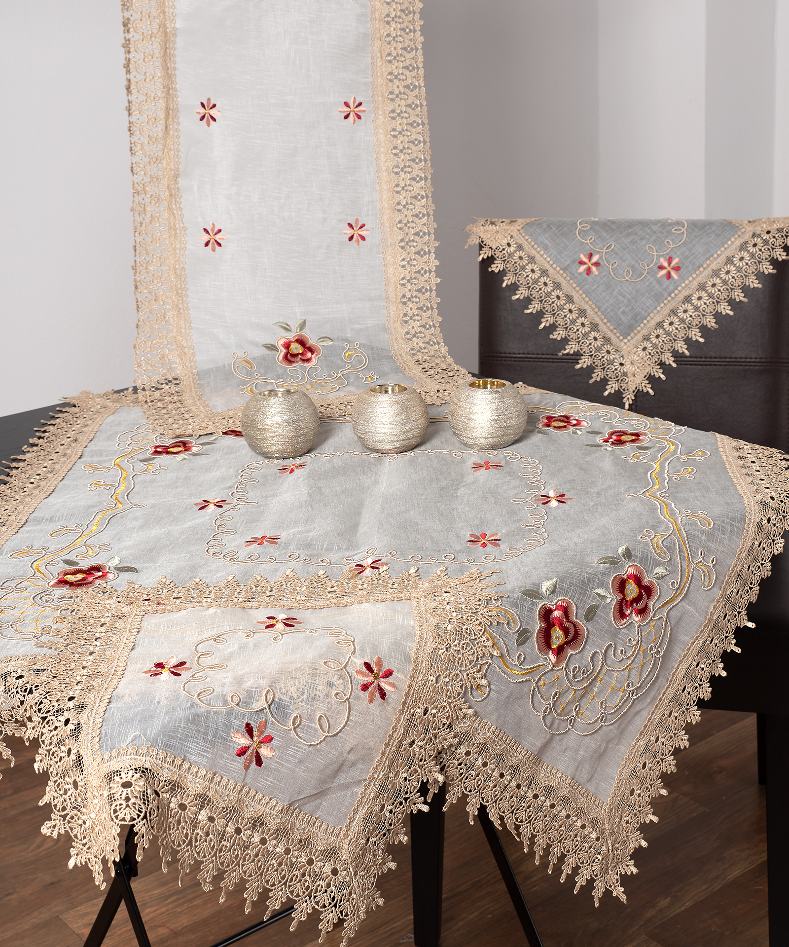 Μοναδικής αισθητικής σειρά με ρομαντικά κεντημένα σχέδια και κομμάτια διακοσμημένα με λασέ δαντέλα. Διατίθεται σε διάφορα μεγέθη : τραβέρσα 45Χ170 εκ. , τραπεζοκαρέ 140χ140 εκ. και σε σετ 4 τμχ. ( καρέ 90Χ90 εκ. , σεμέν 40Χ110 εκ. και 2 γωνίες 40Χ40 εκ. ) Για σπίτια που ξεχωρίζουν …