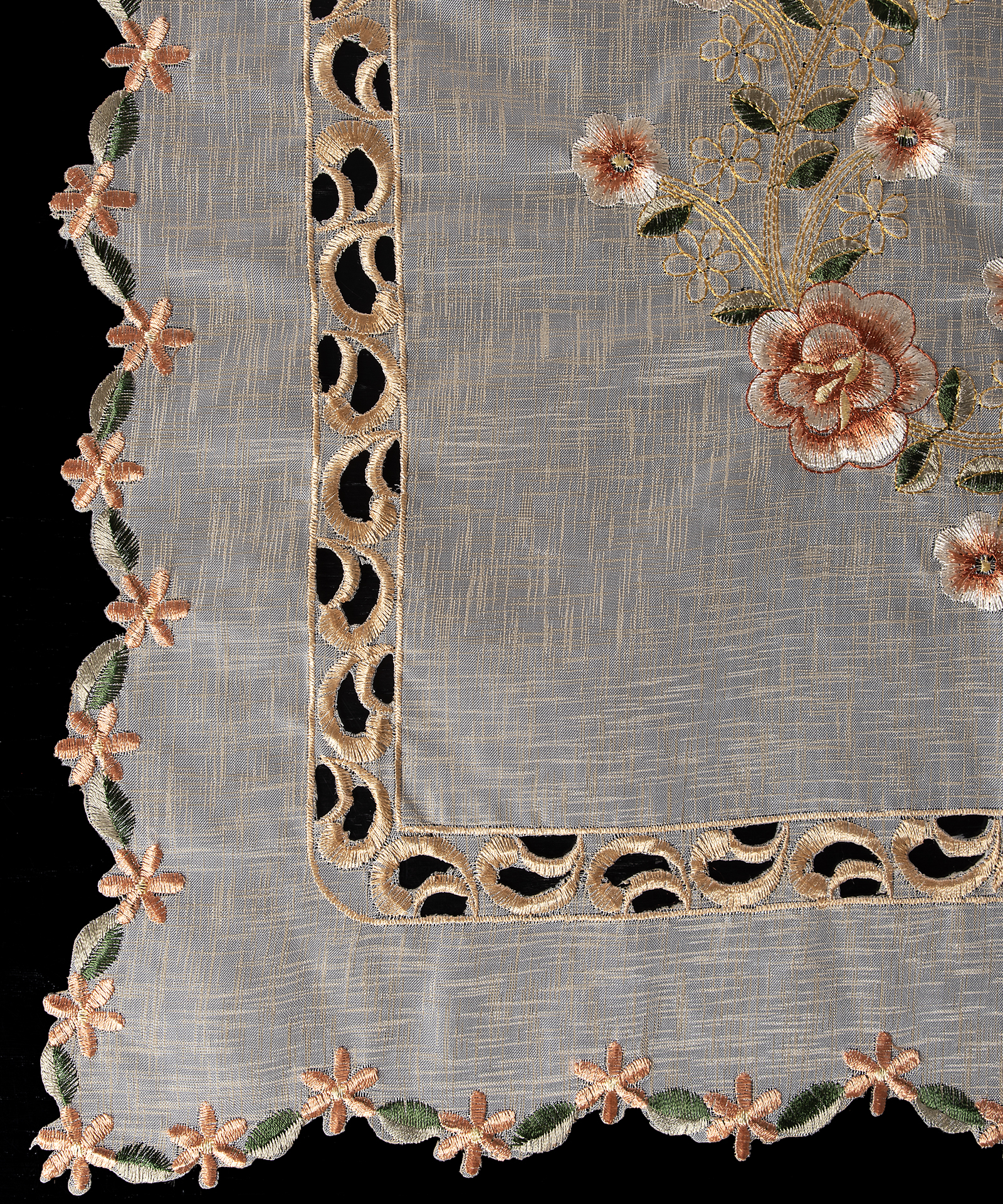 Πανέμορφη σειρά με υπέροχα κεντημένα σχέδια και κοφτά μοτίβα. Διαθέσιμη σε : α) σετ 7 τμχ. αποτελούμενο από τραπεζοκαρέ 140×140 εκ. , 2 πετσέτες 40×40 εκ. , καρέ 90×90 εκ. , σεμέν 40×110 εκ. και 2 πετσέτες 60×60 εκ. και β) σετ 4 τμχ. αποτελούμενο από : καρέ 90×90 εκ. , σεμέν 40×110 εκ. και 2 πετσέτες 40×40 εκ. Για μοναδική διακόσμηση…
