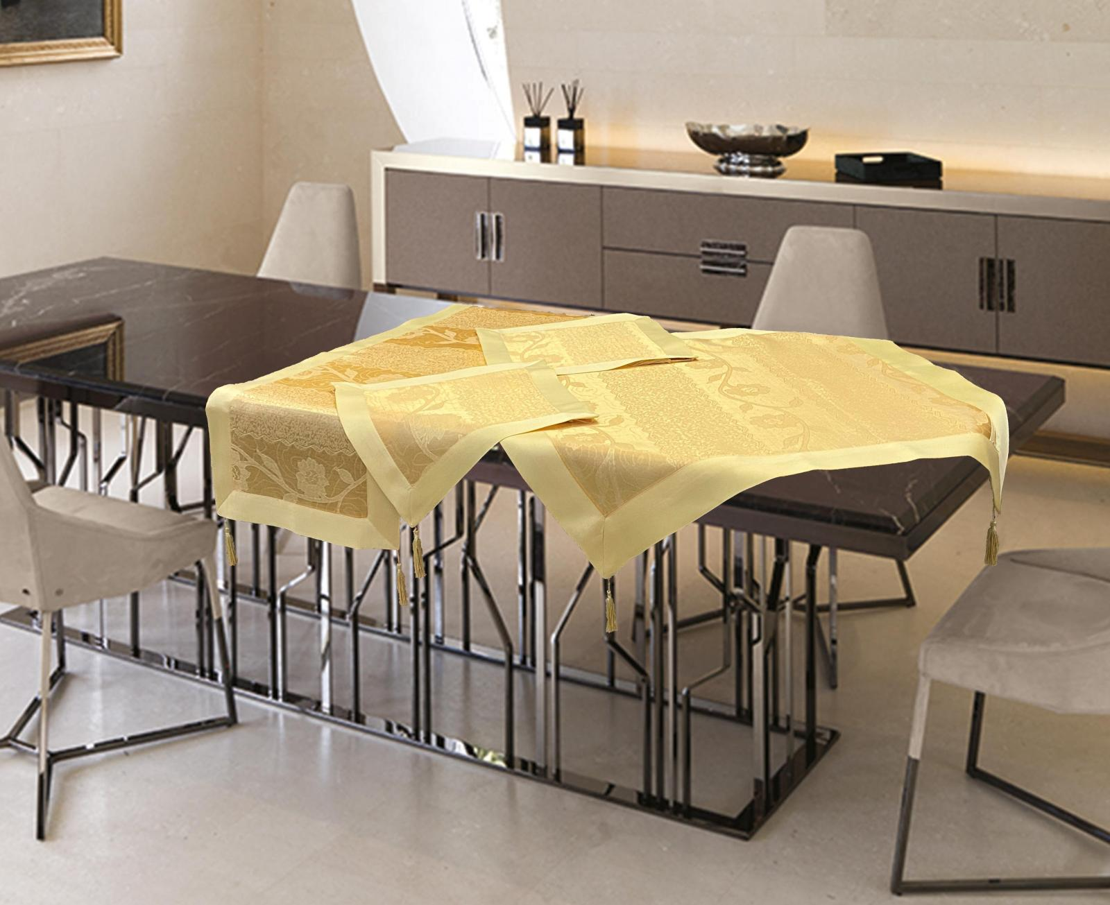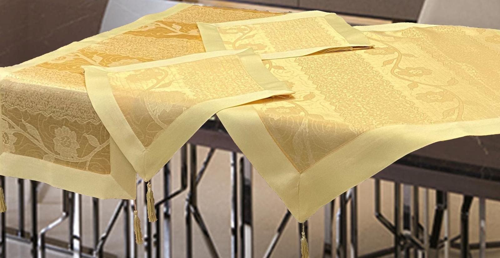 Πανέμορφη σειρά με υπέροχα σχέδια ζακάρ και σατέν φάσα. Διαθέσιμη σε σετ 7 τμχ. αποτελούμενο από : τραπεζοκαρέ 140Χ140 εκ. , 2 καρεδάκια 60Χ60 εκ. , καρέ 85×85 εκ. , σεμέν 40×110 εκ. και 2 πετσέτες 40×40 εκ. Για μοναδική διακόσμηση…