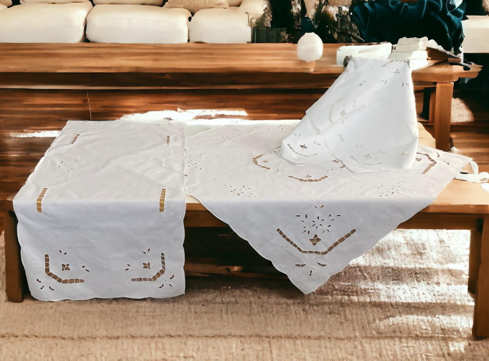Σετ 7 τμχ. αποτελούμενο από : τραπεζοκαρέ 140Χ140 εκ. , 2 καρεδάκια 60Χ60 εκ. , καρέ 85×85 εκ. , σεμέν 40×110 εκ. και 2 πετσέτες 40×40 εκ.