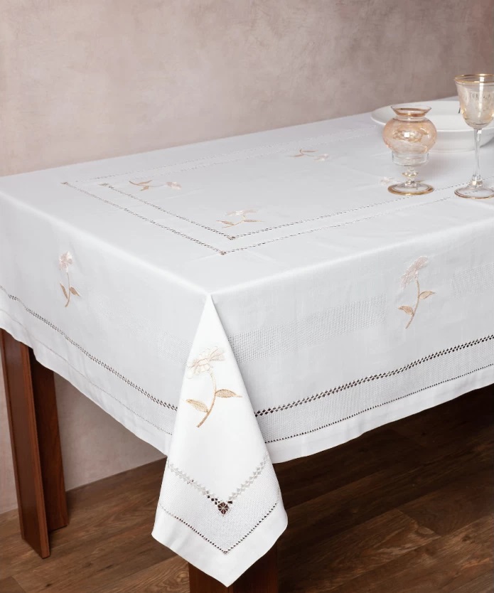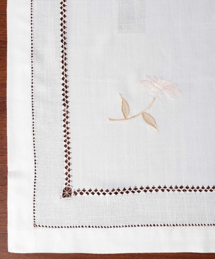 Τραπεζομάντηλο με κέντημα το οποίο πλαισιώνεται από αζούρ και τρυπογάζι.