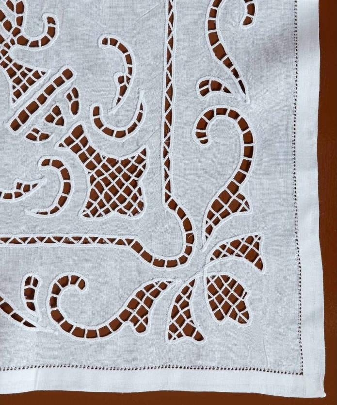 Χειροποίητο τραπεζοκαρέ 140Χ140 εκ. , σε λινό πανί με κοφτή δουλειά. Λευκού χρώματος.